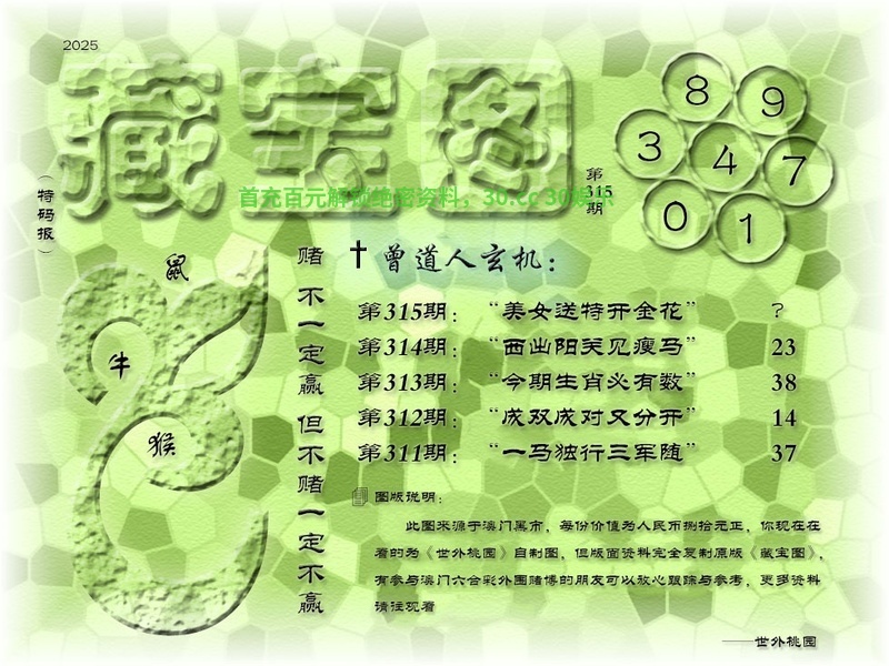 314期藏宝图曾道人玄机:西出阳关见瘦马 解:阳关,解阳肖牛虎兔羊猴鸡 解特肖:牛虎兔羊猴鸡马 |